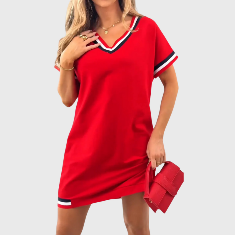 Hetha™ kleita ir tavs iecienītākais apģērba gabals, ja vēlies komfortu un modernu izskatu. Ar tīrām līnijām un kontrastējošiem elementiem V veida kaklā un piedurkņu malās, tā ir iedvesmota no koledžas stila un rada jaunatnīgu un dzīvīgu izskatu. Tās brīvais piegriezums pielāgojas tavai figūrai, nodrošinot kustību brīvību, vienlaikus garantējot dabiski glaimojošu siluetu.