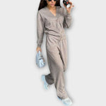 Izveidots sievietēm, kuras novērtē gan stilu, gan komfortu. Ideāls brīvdienām mājās vai elegantiem ikdienas iznācieniem, šis komplekts ir neaizstājams jebkurā sezonā.