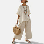 Vienkārša tīrība ar dabisku elegance. Komplektam ir vaļīga un monohromatiskā silueta, kas ir ideāla tiem, kas meklē komfortu un tīru stilu. Izgatavots no viegla auduma, šis izskats pavada katru kustību ar svaigumu un relaksētu eleganci.