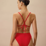 For a striking one-piece option, this swimsuit combines a bold red hue with a ribbed texture and cross-back design, providing both style and support for your swimwear collection.
